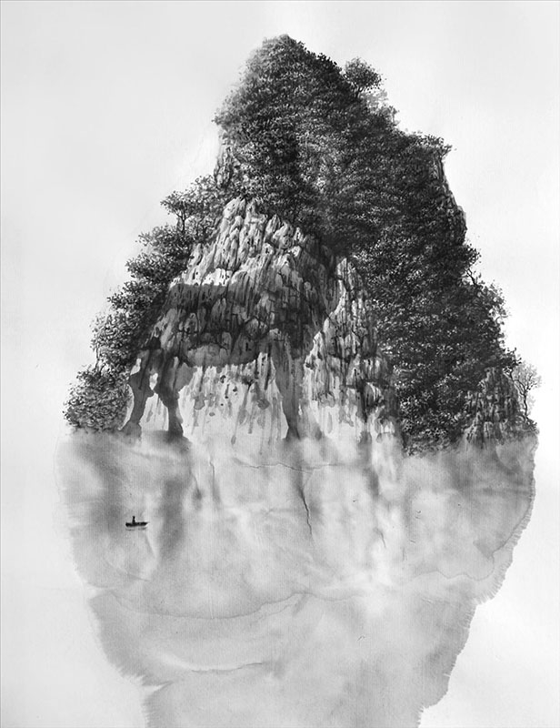 Entrons dans le paysage, L’île du cháman. Un pic rocheux dont les arêtes s’adoucissent d’un fourmillement de végétation. La surface de l’eau miroite ses contours et les prolonge au-delà du papier. En contre-bas, un intercesseur – une barque et son imperceptible passager – nous interpelle. Une portion de l’île-montagne, nue de forêt, est parcourue d’une traînée d’encre noire. Sa dilution circonscrit une forme dans laquelle se devine un cerf aux bois printaniers. Image double, L’île du cháman revêt une dimension hallucinatoire propre au registre visuel que développe Rubén Fuentes dans sa série des Paysages Mentaux exposée pour la première fois à Paris sur l’invitation de la Galerie Felli. Image mentale, L’île du cháman tire sa forme du cerf qui soutient ses fondations. Dans son ensemble, les 23 paysages de la série livrent une représentation irréelle de la nature et de ses occupants, un condensé d’impressions et de souvenirs d’intensité contemplative, une nouvelle réalité non photographique.
