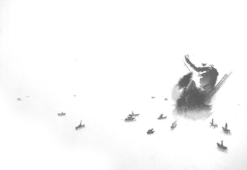Dans une mise à distance du réel tangible, Rubén Fuentes s’adonne à l’illustration d’une nature anthropomorphique (Depuis mes mains, La présence, Présences, Gaïa), d’une personnification animalière du paysage (Ours-montagne, L’île du cháman, La montagne infinie, El viaje de la montaña, El viaje del rio), ou encore d’un quotidien, objets et habitats, tapissé de végétations (La chaise, La table, Sans titre, La chambre, L’escalier, Barrière sans porte, Le village du silence). Ces différentes métamorphoses reposent sur une grammaire visuelle où s’entrevoit la récurrence de quatre motifs- sujets : l’eau, la montagne, l’arbre et la brume. Ce quatuor relève d’une double ascendance. Chez Rubén Fuentes, l’appréhension du paysage est d’abord orientale à travers le concept chinois du shanshui, littéralement « paysage des monts et des eaux » associé à deux principes cosmologiques, le yang (la montagne) et le ying (l’eau). Les Paysages Mentaux de Rubén Fuentes empruntent à cette tradition le rejet de l’illusionnisme pictural au profit de la retranscription de pensées et de sensations nées de la contemplation de la nature. Quant aux outils et techniques du peintre, une proximité se tisse également. Pour ne citer qu’elles, la procédure chinoise du pomo (l’encre brisée) alliée à sa voisine japonaise hatsuboku (l’encre éclaboussée) constituent le point de départ du Boléro de Ravel, des Arbres dans le brouillard, et des quatre Paysage nés de l’unique trait de pinceau. Ici, la tache suggère le paysage et dicte sa configuration. Prenons le cas du 16ème opus des Paysages Mentaux. Une forme excentrée évoque une embarcation maritime. À la naissance de ses voiles, une masse rocheuse sert de terreau à une forêt luxuriante. Autour, une quinzaine de barques s’apprête à accoster les rives de l’île-refuge. S’y décèlent une girafe, un bouc, un lapin, peut-être même un chimpanzé. Un trait de pinceau, un paysage. La nature pour seul pèlerinage. L’aléatoire, au cœur du processus créatif de Rubén Fuentes, combine à la spontanéité première du geste, la minutie des détails et la gestion équilibrée des pleins et des vides. D’évidence, la reprise des techniques traditionnelles de la peinture orientale s’accompagne d’un détournement. Nulle calligraphie signifiante ne vient soutenir l’image. Rubén Fuentes use pour unique idéogramme : le tourbillonnement du feuillage. Ce signe graphique est à la fois l’élément structurel et le sujet principal des Paysages Mentaux. La danse du calligraphe se traduit également en peinture à l’acrylique (Gaïa, La présence, La chambre, Arrivando a la gran ceiba, La barrière sans porte, Présences) et à l’huile (La chaise, La table). L’entrée du chromatisme et l’agrandissement des formats ne sont pas les seuls attraits de son usage. La possibilité d’accentuer brumes et brouillards prédomine.