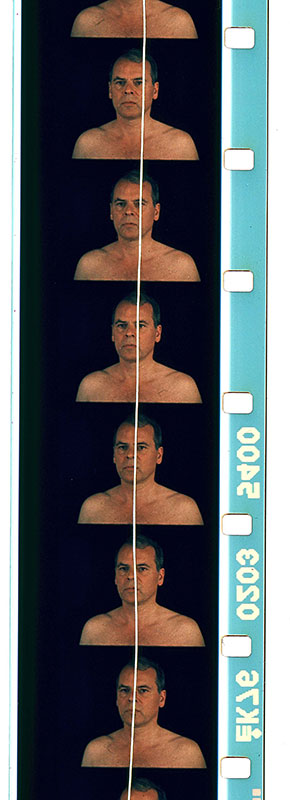 Le dernier aspect, et pas le moindre, de ce travail que je voudrais souligner ici, c’est l’utilisation de l’accident chez l’artiste — l’accident lié au médium ! (Comme chez Éric Rondepierre.) Soit le film montré en boucle de film 16 mm sur verre dépoli, Autoportrait ciselé : le film de 30 m a été rayé verticalement sur toute sa longueur, après développement ; il en résulte une belle rayure lumineuse blanche (fig. 3), de la taille d’un rouleau de scotch, qui coupe littéralement le portrait en deux : zip ! ouverture radicale attestant d’un travail de la main (au scalpel) de l’artiste, présence même de la création — comme chez Barnett Newman.