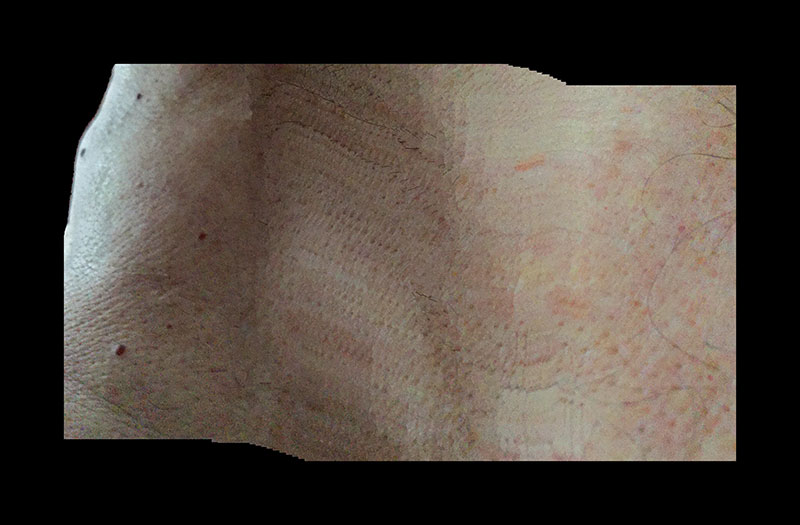 À cette incision radicale verticale (voulant souligner le déroulement vertical du film de cinéma, nous a dit l’artiste), succède aujourd’hui, dans sa dernière série en cours, « Fragments » (2019), une prospection (un sondage) des possibilités de la fonction « panoramique » de « l’appareil photo » d’un simple iPad ; retournant l’objectif vers son corps, déplaçant celui-ci durant la prise de vue de façon horizontal, Lebrat a réussi à prendre en défaut l’IA (Intelligence Artificielle) de son outil ; il en a résulté un beau zip horizontal entièrement dû au hasard : criss-cross ! La peau (de l’artiste) est découpée, écartelée (fig. 4). Lebrat a réussi à prendre en défaut la seule qualité qu’on puisse reconnaître à un objectif photographique d’iPad : reproduire fidèlement, par calcul, le réel (qui est autrement plus intéressant à scruter directement, sans cette médiation, soit dit en passant). L’accident numérique s’est produit. L’accident, c’est la vie. La boucle est bouclée. Et ce texte aussi.