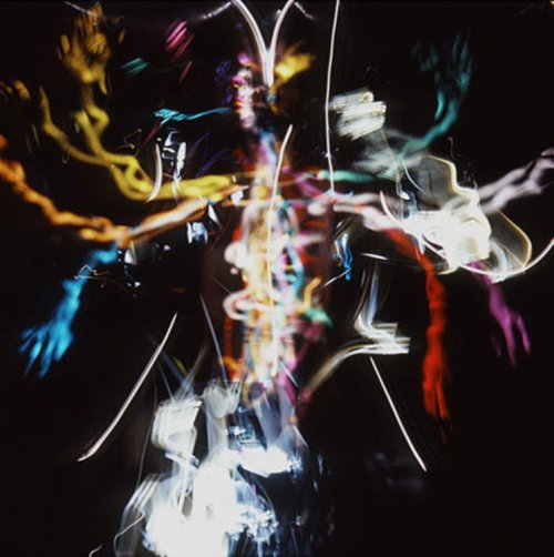 Ce qui caractérise le plus son travail avec toutes sortes de « chambres obscures », c’est qu’il pousse au maximum leurs possibilités intrinsèques, n’hésitant pas à en utiliser les accidents : The photo is the medium ! J’ai déjà décrit, dans mon texte cité supra, son travail sur les rubans de pellicule Kodak 120 6x6 ; j’ai appris ici, en l’écoutant parler, combien toutes ses séries sont faites dans l’appareil photographique lui-même (qu’il soit dit de « moyen format » (6x6) ou… iPad) : aucun travail de postproduction (si ce n’est des tirages impeccables), surtout pas de Photoshop, ce logiciel à tuer l’ontologie photographique (le « ça a été » barthésien) dans l’œuf. Mais le noir. Lebrat nous a dit ceci, de fondamental dans son œuvre : « Tout mon travail photographique et cinématographique est fait dans le noir. Quand je produis mon travail, et même quand il est fini, je suis dans le noir : je n’ai aucune idée de ce que cela va donner. Le tirage seul, décalé dans le temps, m’en donnera une idée. » Le radicalisme de cette conception trouvant son acmé dans la série « Torses » (fig. 2), où l’artiste pose un appareil 6x6 sur un trépied, en ouvre l’iris, et en un temps de pose plus ou moins long, performe avec des objets lumineux, une sorte de danse dionysiaque. Le résultat est une chose, il me semble, qu’on a jamais vue avant (même si le résultat n’est pas sans faire écho au travail d’Étienne-Jules Marey, quand celui-ci peignait sur les costumes noirs de ses modèles des lignes blanches pour en étudier le mouvement en autant de traits de lumière) : une sorte de rite initiatique chez les Indiens-Hopis-devenus-photographes :