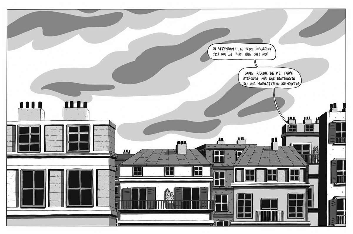 J’ai commencé cette BD par les « pensées du jour », que je publiais régulièrement sur ma page Instagram. Quand la question s’est posée de réaliser un album à partir de Michel. J’ai d’abord retravaillé toutes ces courtes scènes de « pensées » en une ou deux planches. J’ai ensuite imaginé que faire vivre une aventure à Michel, en plus des « pensées », pouvait donner un rythme à l’album. L’alternance entre le noir et blanc des pensées et la couleur de l’aventure principale permettait de bien définir ces deux temps de l’album. Le noir et blanc permettait aussi d’inscrire les pensées de Michel dans une intemporalité en comparaison avec son aventure principale.