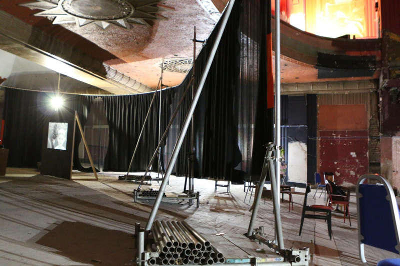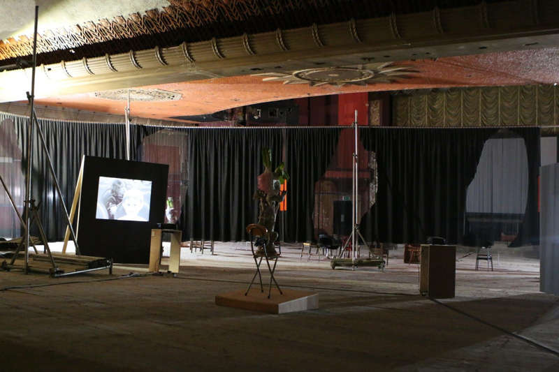 One of the Biennial venues is the ABC Cinema–an old abandoned movie theater that looks as if time has eaten the surface of the inward parts of the building : the orange and gold colored walls have fallen in and become porous. The porosity of the interior allows the “air” of the world to enter and metamorphose the interior. This year, art has flowed inside. After stepping into the dark entrance, you encounter multiple old video footages of people in everyday life, which are projected on the makeshift wooden panels scattered around the space. Some of them are playing in reverse as if time flows backward. Around the video screens, an inwardly curving curtain encompasses the space. Some parts of the curtain are translucent so that people can see other things through it. The flow of invisible currents of history circulates inside the old theater like the blood in the veins of our body.