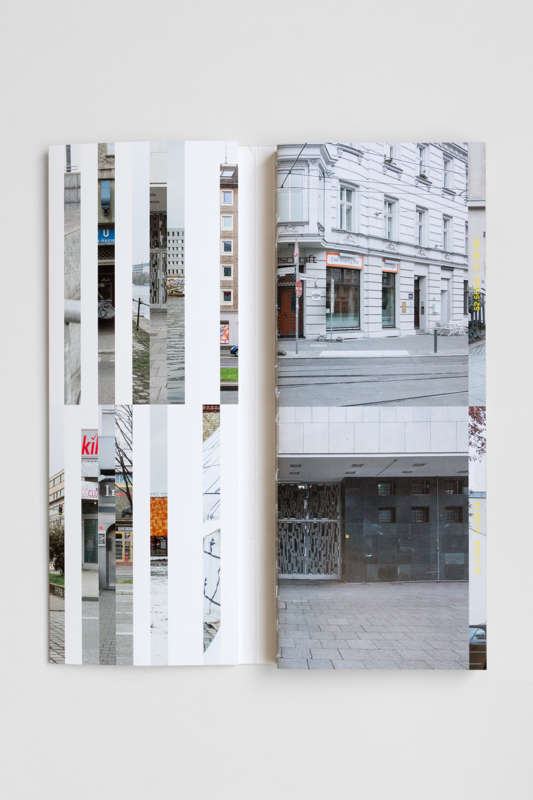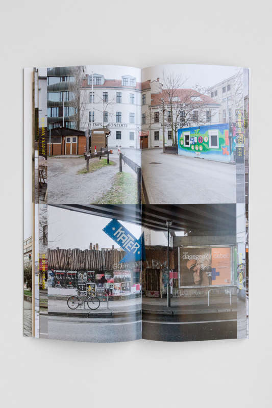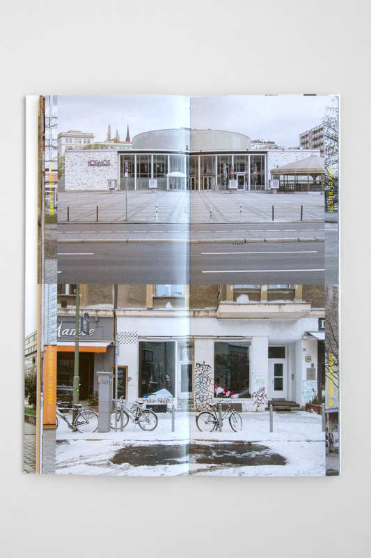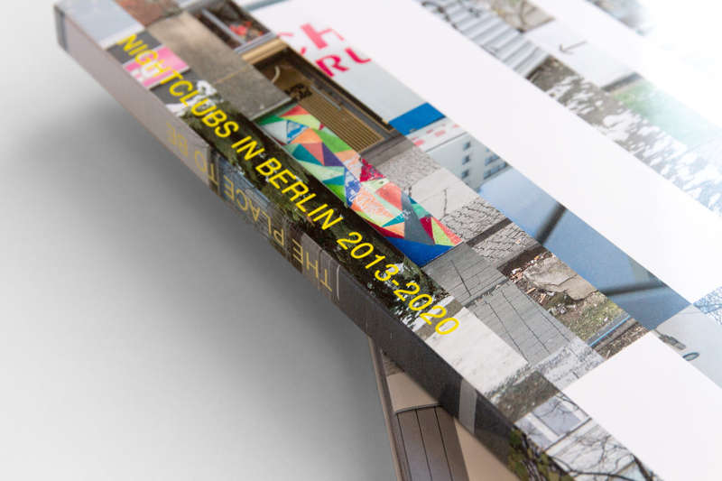 Le livre de Julie Chovin, sobrement intitulé The Place to be. Nightclubs in Berlin (2013-2020) et publié chez Vexer Verlag, se présente comme une carte géographique pliée de 30 x 12 cm, format éditorial créé spécialement pour ce projet par le studio de graphisme Daniel Rother. Le titre apparaît en gaufrage sur le recto de la couverture, tandis que les noms de l’artiste et de la maison d’édition se retrouvent au verso. Des rabats viennent protéger l’intérieur, dont l’un contient deux courts textes scientifiques de Boris Grésillon et de Séverine Marguin, sur lesquels nous reviendrons. Rappelons que la série The Place to be se déploie en 220 clichés d’entrées de clubs berlinois, pris de jour, de l’extérieur et de manière frontale, en couleur et en 24 x 36, selon un protocole régulier. La mise en pages les superpose deux à deux, en y joignant leurs coordonnées GPS, sur papier brillant. Enfin, la reliure suisse qui a été proposée par le studio de graphisme concourt à transformer ce livre de photographies en livre-objet ou en livre d’artiste que l’on voudra intégrer, au titre d’élément au sein d’un ensemble ouvert, dans sa bibliothèque idéale. Une édition ultérieure et limitée de cet ouvrage s’enrichira d’une carte.
