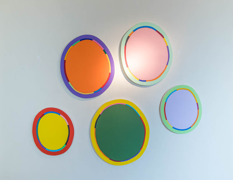 L’istallazione di Vincenzo Frattini espande lo spazio con ovoidi che conducono, nella loro vagante traiettoria, verso un’orbita generativa della forma della luce. Si dirama un cosmo di grembi policromi, habitat di lirica emanazioni di luce, coronate da aureole che segmentano i colori e li legano in un circolo analitico. La pittura di Frattini è scientia del fare che intona canti polifonici. Dove “la pittura non celebra mai altro enigma che quello della visibilità” (Merleau Ponty). Tutto è nello sguardo e per lo sguardo. Non v’è profondo se non di superficie. Se si sospetta una simbolica, essa ha l’immanenza del gesto costruttivo. Si riflette obliquamente nell’opera, emanata da archetipi generanti forme, segni, geometrie. In spazi unici e plurali, in estensioni di ‘altri orizzonti’ dove scienza tecnica, natura e mito s’incontrano nella loro prima essenza. Una specie di mondo parallelo. Dimore chiarissime dell’altrove ?