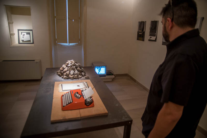 La camera di Pier Paolo Patti è il luogo del pensiero che riflette l’ esperienza tragica della storia. I frammenti dell’accadere sono deposizioni di resti e reliquie, archivi stratificati della memoria lacerata. Il nudo ferro del tavolo che fa centro nello spazio come un altare di una liturgia senza Dio, è il piano dove ‘cadono’ il senso e il dis-senso delle azioni storiche. Tra il cumulo di pietre, resti di un’antica lotta o di una catastrofe della città, e la macchina ‘anacronistica’ della scrittura lasciata alle trascrizioni del visitatore, passa l’oblìo del tempo e insieme la sua resurrezione negativa, come mancanza, assenza dei nessi e degli incroci, come se ogni ‘segno’ fosse l’orma di un evento mai avvenuto ma che lascia nella storia umana le sue risonanze e gli echi, in un paradosso di trasposizioni temporali e di archivio delle assenze. Anche il video della natura umana concepente relegato ai margini della cerimonia centrale, è il frammento ormai slegato, separato, del mistero della nascita.