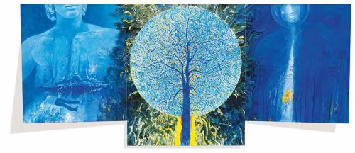 L’iper-simbolismo di Gaetano Di Riso si rivela in una rappresentazione che ‘cade’ in se medesima : simbolismo del simbolo. Una narrazione immaginativa, in un trittico di visioni simmetriche, come proiezioni di una memoria circolare, dove il tempo diviene evocazione, risonanza dell’inconscio collettivo che traspare in archetipi di panteismo immaginale. La narrazione iconica di Di Riso è la manifestazione del sostrato magico del tempus naturalis, dove le cose e il pensiero levitano nel simbolico, si collegano alle forze sconosciute dell’anima della terra. La gloria, il cosmo, l’amore e la morte si dissolvono gli uni negli altri come in un richiamo di forze occulte eppure luminescenti, in una luce proveniente dalle cose che la estendono in un fontale, imperscrutabile fondo-radice.