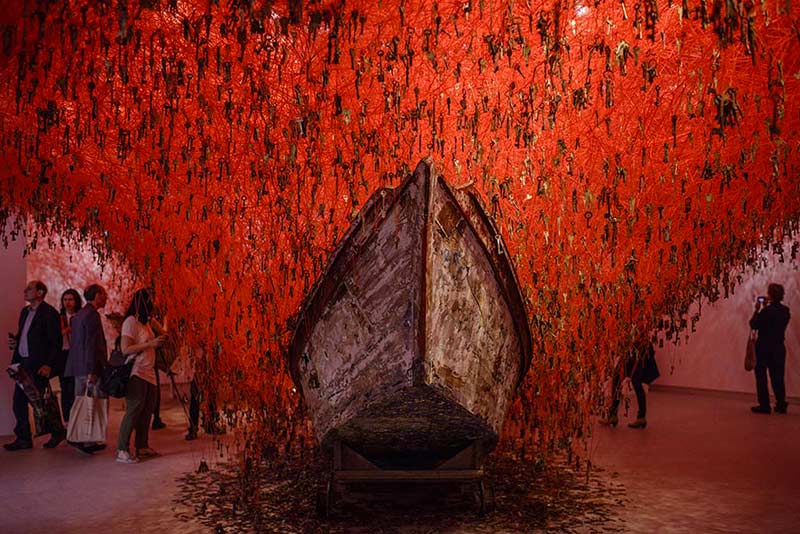 La rigueur du pavillon autrichien ne laisse pas de confiner à l’asphyxie mentale. Le vert du pavillon égyptien imite par trop bien la couleur de l’herbe. Les éclats de verre du pavillon norvégien ne sont justement pas indemnes de ces voix. Les tourments de l’histoire engluent le pavillon russe dans une allégorisation évidente. Le capharnaüm du pavillon canadien nous fait trébucher sur des choses prises au pied de la lettre. En proposant de le mettre en ordre, l’inventaire du pavillon australien nous plonge littéralement dans la confusion du monde. Le pavillon slovaque met en scène une fois de plus la relation déceptive parce que présupposée directe entre une image et son référent. Le pavillon français nous emmène dans un voyage macbethien dans lequel les arbres certes ne nous assaillent pas mais nous convient à une paix impossible. Le pavillon grec nous renvoie à la déception immémoriale d’exister que n’abolit jamais le passé même sauvé pour un instant de l’oubli. Le pavillon coréen nous embarque vers le nulle-part d’un demain qui n’adviendra jamais. Le pavillon israélien tente de rapporter le réel à son image et cette image à un réel écrasé. Le pavillon anglais exacerbe la métaphore au point qu’elle s’exhibe allégoriquement. Le pavillon japonais nous enferme littéralement dans un monde où l’absence de clé métaphorique vient buter sur la profusion allégorique de clés bien réelles, abstraites pourtant puisque ne servant à ouvrir aucune porte pas même celle de notre esprit.