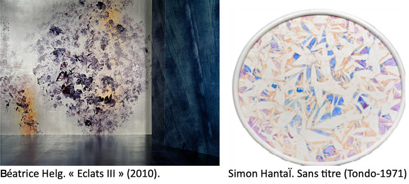 Et puis elle joue avec l’ekpyrosis [3], rapprochant des plaques de toutes natures, sombres ou translucides, pour qu’elles finissent, avec la gravitation « multiverselle », par se percuter. C’est ce qu’elle appelle des « architectures éphémères », titre chapeautant différentes séries. Conflagration ! « Éclats » ! Précisément, en le considérant attentivement, l’un de ces « Éclats », tout rond qu’il était et présentant plein de déchirures bleuâtres, ou de morceaux d’univers éclatés, sur un fond tout blanc, me renvoyait à un tondo de Simon Hantaï. Le blanc du fond c’est le rayonnement de cet éclat, la lumière qui se propage dans l’hyperespace suite à l’entrechoquement de deux ou plusieurs univers. La toile de fond du cerveau de l’artiste vrai est constellée d’images, de références artistiques plus ou moins conscientes. C’est ce que m’a confirmé Béatrice Helg, toute ravie qu’elle était du rapprochement de son œuvre avec celle d’Hantaï, artiste qu’elle déclare adorer.
