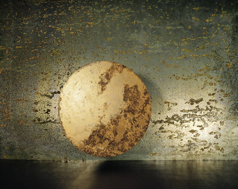 La toile de fond de ce théâtre de l’incommensurable, le mot « théâtre » est essentiel pour Helg, est comme un bout de drap tout noir qui aurait été déchiré, un morceau infime de l’Infini, du Vide. Mais, à l’inverse du Néant qui est le grand Rien, le Vide est une mer passablement agitée, une bouilloire toujours au bord de l’ébullition. Le Vide n’est donc pas vide mais empli d’énergie, une énergie à peu près calme, minimale, appelée « énergie du point zéro ». Dès qu’il y a énergie il y a naissance de particules et, dans le même élan, de leurs antiparticules. L’antiparticule d’une particule présente les mêmes propriétés que cette dernière, même masse, même spin, c’est-à-dire même mouvement, le « moment cinétique », mais elle a une charge électrique strictement opposée. Toute particule a son antiparticule et dès qu’elles sont en contact elles s’annihilent, elles s’évanouissent dans un éclair de lumière, ce qui fait que ces paires particules-antiparticules meurent aussitôt que nées, d’où leur nom de « particules virtuelles ». Le Vide, tous les vides, les poches de l’espace-temps, ceux de notre environnement, ceux de nos corps, au cœur même des atomes, grouillent de particules virtuelles. Par accumulation en un certain endroit elles peuvent déclencher le Big bang ou faire s’évaporer un trou noir, quand même. On appelle ça des « fluctuations quantiques du vide », ou de la « mousse quantique » selon la jolie image de John Wheeler, « le physicien des physiciens » comme le nommaient ses pairs. La toile de fond du théâtre de Béatrice Helg, dans ses séries « Éveil », « Cosmos » ou encore « Transparence », « Espace-lumière », est souvent constellée de points plus ou moins lumineux, taches soulignées par les flashs de lumière qu’elle a orchestrés, pour moi flashs des explosions de particules virtuelles saisies dans leur instantanéité par son appareil. D’autres, beaucoup plus terre-à-terre, diront que c’est seulement la révélation des taches d’oxydation de l’acier prématurément vieilli.