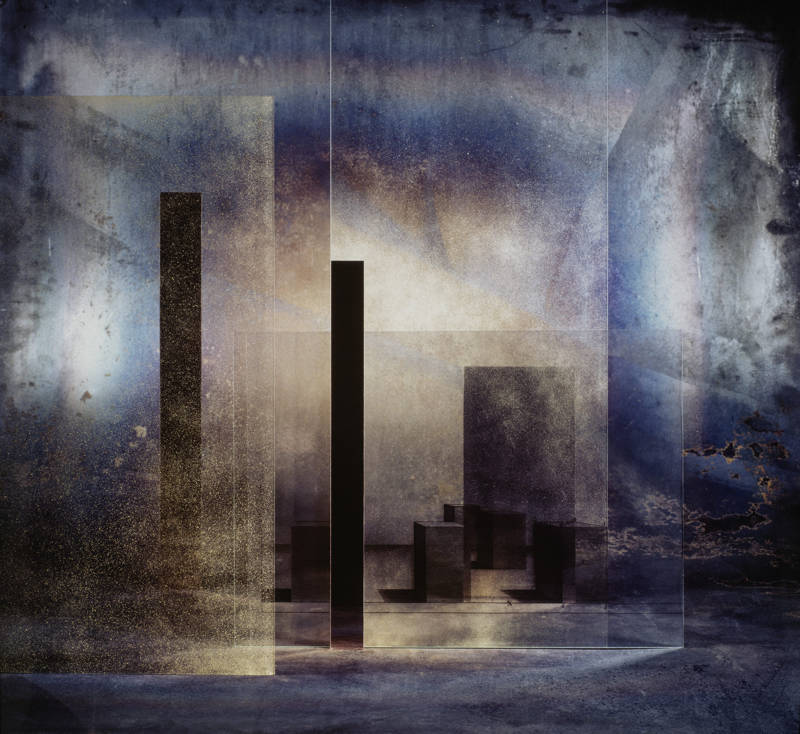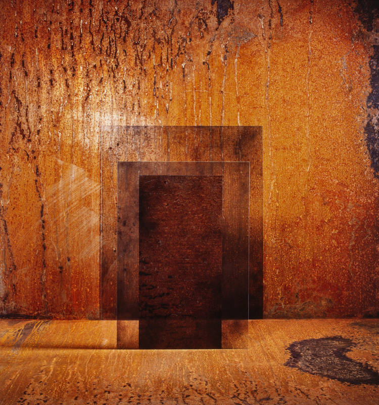 Pour en revenir à Béatrice Helg, avec ou sans l’aide de Dieu, elle se « contente » d’effectuer des prélèvements dans l’Hyperespace, de capturer les univers errants puis de les retenir dans des boîtes de ferraille sans couvercle et dont elle aurait découpé trois côtés afin de les offrir en représentation tels des comédiens campés sur les tréteaux d’un théâtre ô combien cosmique. Plus prosaïquement elle fouille avec méticulosité les décharges des chantiers de construction afin de récupérer les matériaux qu’elle juge intéressants, plaques de métal, vitrages et fer à béton, matières devenues quasi-organiques car ravagées par le Temps, les intempéries et l’inconséquence des hommes. Puis elle réalise à partir de ceux-ci des sculptures que certains qualifient de minimales, mais ils ont tort car le minimalisme n’existe pas, ou plutôt que des sculptures de véritables maquettes architecturales qu’elle soumet ensuite à l’arbitrage d’une lampe pilote, halogène ou autre, et qui lui permet de définir ses sources et ses angles d’éclairage. Enfin, par la coordination d’une batterie de flashs, elle prend des photographies, au départ uniquement à la chambre, travaille ensuite en cibachrome, pour la pureté de son expression bien sûr, et aujourd’hui essentiellement en numérique ce dernier lui ouvrant de nouvelles perspectives, lui apportant un nouveau regard ainsi qu’un réel confort car les images numériques sont des matrices de chiffres que l’on peut triturer à son goût, selon ses intentions. Une fois les photographies prises, les installations sont détruites ce qui interdit toute répétition et insuffle une dynamique dans la création. Chaque image est une nouvelle installation. Helg affirme qu’elle a toujours l’image en tête ainsi qu’un format avant de la créer. Elle déclare aussi qu’elle n’a pas de recette, pas de règles, pas de méthode, car tout ceci limite l’exploration. Voilà pour la technique, la méthode, quoiqu’elle puisse en dire il y en a bien une, mais c’est ici une description très sommaire du fait de mon insuffisance criante en ces matières car pour moi tout ceci relève purement de l’alchimie, voire de la magie !