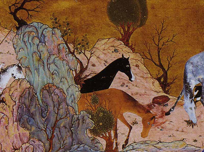 Comme on finit un rêve en se levant brusquement, dans la crevasse on s’ébroue, on sort du piège, on se secoue et la course reprend, cavalcade éperdue que ne ronge aucun frein, on le dit de cette manière, cavalcade que rien ne retient donc, toute à la fuite étourdie et confuse sans plus d’amour, ni de haine ! Hé, hé, hé ! Des talons s’agace la cavale, du lointain se brouille le regard, toujours devant, l’étendue des sables et puis un cavalier, ombre que les vapeurs mollissent, je le dis ainsi : apparition, miracle ou destin, c’est Ali qui se presse, bientôt il est sur lui, moins fatigué, il rattrape l’ami qui veut fuir : loin de moi ami, amant de Leila, je ne veux plus de toi, laisse courir mon cheval. Ali par la bride retient la cavale qui docile à la main amicale marche doucement, les deux hommes sont proches : qu’y a-t-il, qu’as-tu ? Leila et toi enlacés sur le lit, crois-tu que je n’ai rien vu ? Ah, l’ami, ah mon bon, ce ne sont qu’amicale tendresse, point d’amour je le jure. Tu le jures ? Oui ! Alors tous deux en compagnie, ils gagnent le chemin du retour, Leila par ici ou là, elle attend, voit venir la paire, deux amis de toujours, et son sourire, rubis et diamants, s’élargit mais alors… Alors, écoutez bien, alors vint sur la droite une bande de pillards Houkruz, sabre en main et violence surgie, renoncerait-on au butin qu’on peut prendre facilement. Une femme et deux hommes ce n’est rien, on file, on saute, on cravache les cavales et c’est la course ! Hou, hou, hou, je le chante : c’est la course éreintante, sauve qui peut, chacun roule pour sa vie, n’en est-il pas toujours ainsi ? Leila prise en chasse mais les deux hommes ses amis, les deux hommes, leurs vies sans elle ne les tente plus. Voilà l’appât, voici le gibier, deux hommes à fine monture, richesse dans les ceintures, harnais de luxe, selle kirghize. Soudain, oui soudain il faut le dire ainsi, la surprise est stupeur, un homme, malfrat maudit, homme harcelant la vertu, immonde créature soudain sur les épaules de Leila d’un bond se jette. Elle tombe dans la poussière, se démène, l’homme dessus déjà, l’homme sans honneur, voleur d’hymen et les deux cavaliers harcelés derrière à leur tour tourmentés, on lance contre eux, il faut le croire, un léopard et un lion toutes deux bêtes féroces. Que faire, il n’y a pas de chance, il faut fuir ou mourir. Ali guerrier véloce sur le léopard qu’il blesse mais à son tour ce dernier, voyez comme on l’exprime, la bataille est complexe, ce dernier mord, crocs puissants dans la jambe plantés. Et tombe le cavalier, et le Lion s’entremêle bientôt, à coups de dents se déchire la chair que les fauves se disputent. Voici Rowshan qui survient, il voit le drame, le tragique l’atteint, ah, les pleurs, il en faudrait mais il n’est plus temps, il faut fuir, Rowshan fuit, tu es seul, il y va de ta vie ! Je le dis, je le chante, le malheur est sur lui, point d’honneur dans la fuite, qu’en est-il de l’amante ? Les chiens, les fennecs et les hyènes… Oui, c’est cela que rumine dans sa crevasse le Cavalier Rowshan tandis qu’avec sa cavale, il faiblit et s’endort quand le rêve s’empare de son âme …