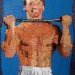 Trivialité, de celle qui, si l’on s’arrête un instant pour la regarder, fait la beauté du quotidien. Petits détails, choses insignifiantes, jeux de couleur et de lumière, ils se subliment dans le long travail du tissage. Trivialité aussi, frisant l’obscénité des ces corps masculins, body-buildés, de sportifs bien membrés, de bière ordinaire… Ils atteignent à une spiritualité goguenarde, reportés sur le fil, entremêlés comme à la mêlée, entrelardés de rose et orange.