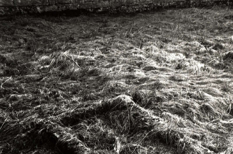 L’angle nord-ouest du jardin est occupé par un muret arrondi en quart de cercle. Il retient un entassement de pierres et de débris de briques. Quelques végétaux y ont trouvé un peu de terre pour s’y installer. C’est un lieu d’abandon et de survie. L’effondrement d’une partie du muret aurait pu rester un évènement mineur. Il aurait suffi d’attendre des journées plus fraîches pour remettre les pierres en place en veillant cette fois-ci à leur parfaite stabilité, mais d’autres désordres sont survenus : certaines dalles d’un cheminement de pierres se sont soulevées et le dessèchement de la pelouse a fait apparaître des concrétions calcaires à l’allure de pustules pierreuses réunies en ossuaire.