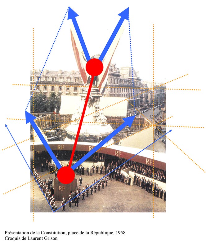 La structuration triangulaire entre ces trois places préexiste indéniablement dans l’espace parisien. Ce qui importe ici, c’est la manière dont les concepteurs du spectacle institutionnel du 4 septembre 1958 font usage, spatialement, esthétiquement et politiquement, de ce triangle. Ainsi, la mise en scène de l’événement ne se limite pas à la seule place de la République : dans un emboîtement d’échelles habile, il s’agit d’une mise en réseau de trois places urbaines qui sont des lieux parisiens emblématiques de la rive droite de la Seine. Au-delà de la plausible métaphore de l’opposition gauche/droite dans la vie politique française, placer cette fête sur la rive droite de la Seine a pour conséquence de la rapprocher symboliquement de l’Élysée, palais présidentiel, et de l’éloigner de l’Assemblée Nationale. L’enjeu de la nouvelle Constitution est, rappelons-le, de passer d’un régime parlementaire à un régime semi-présidentiel : la double métaphore spatiale et politique pourrait donc être pleinement justifiée.