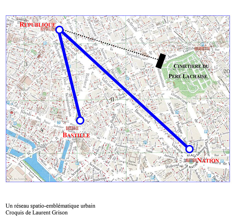 Les trois places urbaines mises en relation forment un réseau emblématique inscrit dans l’espace parisien. Ce réseau, que nous pourrions aussi qualifier de spatio-emblématique urbain ne peut se comprendre que dans un triple mouvement d’intégration. Celui-ci s’appuie, simultanément, sur la dimension urbaine (celle de l’espace parisien et de ses places), la dimension temporelle (celle des références historiques et du présent) et la dimension allégorique et symbolique des lieux et de la statuaire urbaine.