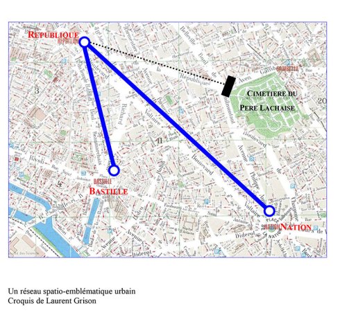 Parallèlement à la dimension temporelle, celle du référentiel historico-politique, et à la dimension symbolique que nous venons d’évoquer, la mise en scène de la présentation de la Constitution de 1958 s’inscrit aussi dans une dimension spatiale fortement signifiante : celle de la place urbaine comme lieu de la mise en lumière délibérée, avec des objectifs politiques plus ou moins affichés. Si on consulte un plan de Paris, on constate que les places de la République, de la Nation et de la Bastille forment un triangle, ou, si l’on veut, un « V » dont la pointe principale serait justement la Place de la République et les deux bras le boulevard du Temple, prolongé par le boulevard des Filles du Calvaire et le boulevard Beaumarchais jusqu’à la place de la Bastille, et le boulevard Voltaire.