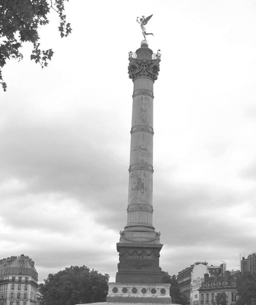 La grande place de la Bastille est un haut lieu parisien. La référence à la Révolution française de 1789 y est explicite. C’est en mars 1833, sous Louis-Philippe, que la Chambre des députés décrète l’érection, au centre de la place, d’une colonne commémorant le souvenir des victimes de la Révolution de 1830. Les corps de plusieurs d’entre elles sont, d’ailleurs, transférés en 1840 dans des caveaux situés dans les soubassements. à ces morts, sont ajoutés, une dizaine d’années plus tard, ceux de la Révolution de 1848. La colonne ne mesure pas moins de 51,50 mètres avec la statue. Sur l’assise circulaire en marbre blanc est posé un socle carré dont les faces sont ornées de 24 médaillons en bronze. Sur la face ouest, un lion symbolise l’insurrection de juillet 1830. Les dates des 27, 28 et 29 juillet figurent sur le soubassement et sur la colonne, rappelant les « Trois Glorieuses ». Cette colonne, qui n’a pas la force de La Liberté guidant le Peuple, tableau d’Eugène Delacroix peint en 1831 (Musée du Louvre, Paris), qui exalte la Révolution de 1830, ne manque cependant pas de conviction dans sa présentation massive qui impressionne le passant.