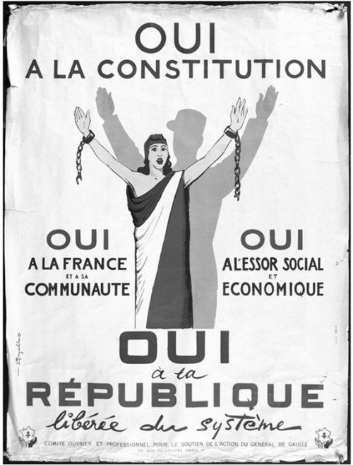 Un entrelacs de références historiques donne à la présentation de la nouvelle constitution une légitimité abondamment soulignée par les exégètes du régime comme Michel Debré et André Malraux, tout comme la presse de l’époque. Constatons d’abord que la statue costumée de la place de la République, figurante involontaire du spectacle, semble entretenir, symboliquement, une conversation avec deux interlocuteurs de métal et de pierre. D’abord avec Le Triomphe de la République, sculpture monumentale et allégorique de Jules Dalou, exposée place de la Nation, environ 3000 mètres plus loin, au bout du boulevard Voltaire. Jules Dalou (1838-1902), républicain militant, communard exilé en Angleterre jusqu’en 1879, est un brillant élève de Jean-Baptiste Carpeaux, célèbre pour son style naturaliste en sculpture. Il exécute Le Triomphe de la République, commande du Conseil municipal de Paris, entre 1879 et 1899.