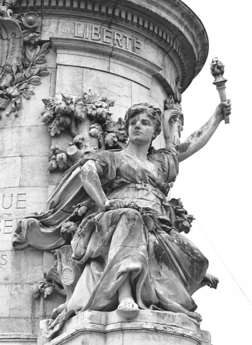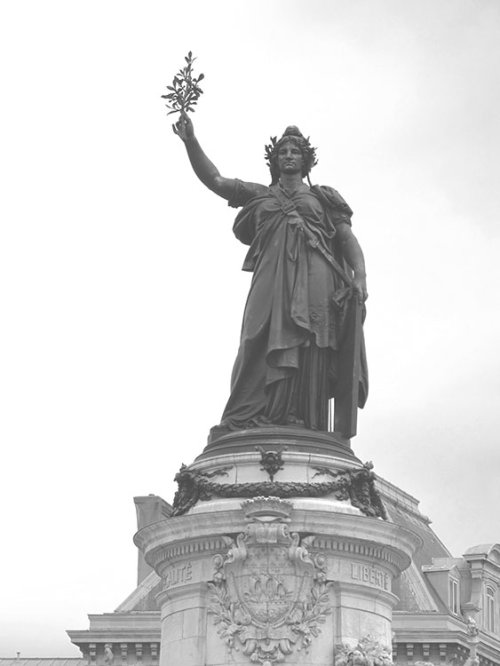 La statue de la place de la République converse aussi avec la Colonne de Juillet, surmontée du Génie de la Liberté, qui s’élève au centre de la place de la Bastille, à 1500 mètres de là, à l’extrémité du Boulevard Beaumarchais. L’axe de la place de la République à la place de la Nation, large et rectiligne, doublement emblématique, est le théâtre de très nombreuses manifestations, à caractère politique ou syndical, depuis les années 1920. Une photographie fameuse d’Henri Cartier-Bresson, inspirée par l’esthétique baroque, montre des manifestants républicains et antifascistes sur le socle de cette statue de la place de la République en 1958 : Manifestation place de la République, Paris, 1958 (collection H. Cartier-Bresson).