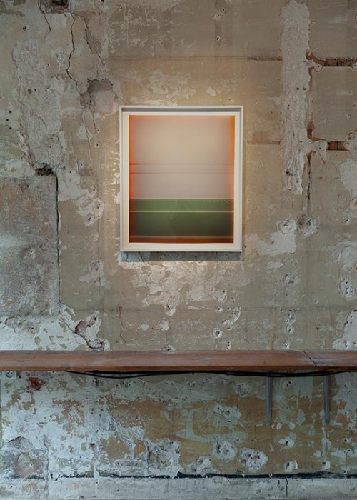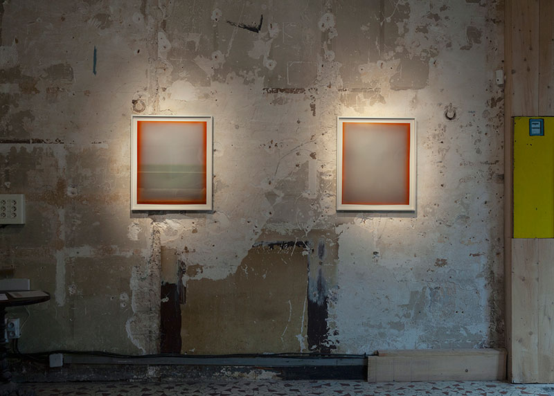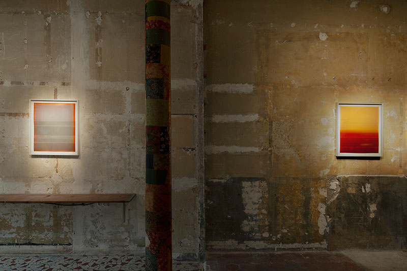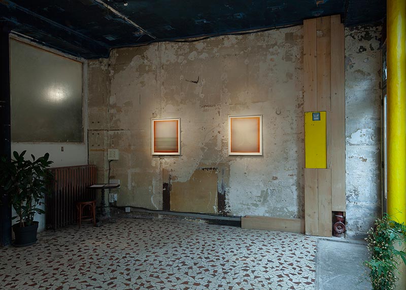 La série aujourd’hui présentée à la Galerie Javault, intitulée Météores, a été pensée pour l’espace de la galerie et marque pour l’artiste l’utilisation d’une technique nouvelle. Produite avec un papier ancien et rare à la brillance et au rendu des couleurs très particuliers, cette série est le fruit d’un jeu de surdéveloppement mécanique de certaines parties d’un même tirage et se veut un travail sur le temps et l’accumulation du temps dans le processus chimique d’apparition de l’image. La série est construite à partir d’un premier tirage monochromatique dont la teinte est obtenue par solarisation et dont l’artiste vient dans un second temps travailler les bords. Viennent ensuite les tirages successifs qui prennent pour fond ce premier monochrome - répété aussi fidèlement que possible, chaque tirage étant unique - et dans lesquels les formes, les strates, sont obtenues uniquement par le développement.