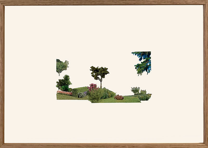Moving inside est un rassemblement, rassemblement d’œuvres ayant pour premier point commun d’avoir été imaginées et réalisées ces derniers mois. Bernard Calet n’a jamais fait mystère de ses champs d’investigation : lieux urbains, habitats, mobilité du corps, mode d’apparition du langage dans notre culture ou mises en scène artificielles issues des médias. Mais Moving inside ponctue aussi son œuvre en confirmant certaines de ses intentions quant à notre époque. Ainsi Bri-collage (2020-2021), Icones (2021), deux ensembles de collages s’attaquent ouvertement à la généalogie des visuels contemporains qui ne cessent d’inonder notre univers. Si le premier (Bri-collage) surgit des prospectus de promoteurs immobiliers ensuite découpés et réarrangés, le second (Icones) dénonce l’absence totale de hors champ dans les illustrations des quotidiens nationaux. Ces deux séries ont donc pour ambition une mutation radicale : transformer par l’action – collages ou rehauts – de simples visuels – l’un commercial, l’autre informatif – en images avec leurs impensés et évidemment leurs hors champs. Dans les deux cas, l’artiste prend ouvertement le spectateur à témoin en le contraignant à percevoir ces œuvres comme des réfutations des stéréotypes aujourd’hui à l’œuvre. Dans un cas, la navrante affirmation d’un idéal petit bourgeois (être propriétaire d’un espace construit sans particularité aucune) devient paysage ou le vide – et donc l’imaginaire – prend toute sa place. Dans le second, recouvrir un banal visuel attestant des calamités du monde par des formes géométriques (en couverture de survie) tend évidemment à contraindre le spectateur à s’interroger sur son indifférence face aux événements du monde au sein des médias. D’ailleurs pour mieux réaffirmer le propos d’Icones, Bernard Calet maintient intacte la double page du quotidien national, laissant visible à travers une simple fenêtre l’image rehaussée, son emplacement dans la publication et son rapport d’échelle avec la page.