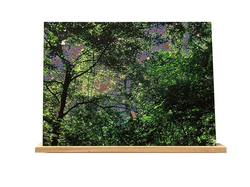 La série Paysage conduction (2022) reprend donc le même principe mais en l’inversant : l’un des genres les plus nobles de la peinture – le paysage - devient photographie, ou plutôt une représentation hybride entre image et visuel, entre réalité et invention fictionnelle. Chacune présente un sous-bois dense avec ses chorégraphies aléatoires de branches et de feuilles, avec quelques éclats de ciel perceptibles dans les creux de la canopée. Lors du tirage (et donc de l’édition), Bernard Calet manipule les couleurs, transforme le bleu du ciel en marron laissant apparaître ici et là des fulgurantes de violet, saturant certains verts et conduisant la photographie à devenir une image camouflage. Chaque élément s’y présente dans une gamme qui le démarque imperceptiblement de son voisin. La densité des éléments renforce ce brouillage visuel. Dans certains creux de la représentation, quelques rehauts à la feuille de cuivre creusent la surface par leurs éclats métalliques. Ce qui est là, devant le spectateur, est tout autant un équivalent d’un paysage naturel qu’une évocation de l’énergie circulant dans et hors d’une image désormais fictionnelle. Telles ces représentations de cerveaux, de synapses, de réseaux infinis, ces œuvres travaillent à la frontière entre plusieurs registres : celui de l’attestation du réel et celui d’une modélisation des énergies (que ce soit celle du cerveau humain ou des ordinateurs). Le spectateur ne sait ce qu’il doit analyser dans cet entre-deux disruptif.