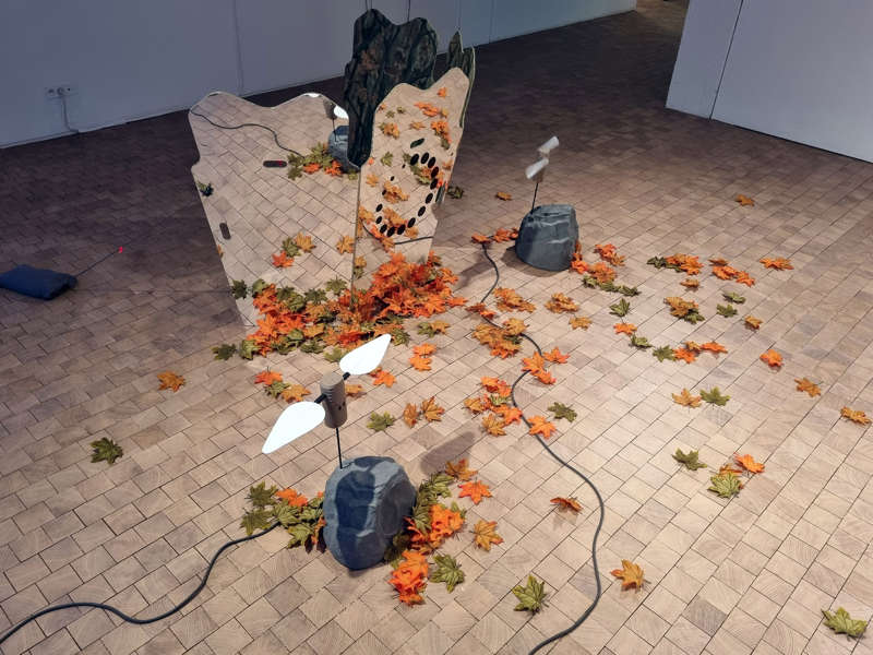 Au fur et à mesure qu’ils se connectent à l’Internet, nous attribuons de l’intelligence à nos appareils électroménagers. Ce qui, d’une certaine manière, leur confère une sorte de supplément d’âme. Jens Settergren a capté les sons de ces mêmes objets-techniques de nos environnements quotidiens avant de les traiter pour, enfin, les dissimuler au sein du paysage sonore et immersif de GhostBlind Loading. Car la musique des sons auxquels d’ordinaire nous ne prêtons guère attention est diffusée au travers d’enceintes aux allures de rochers disponibles dans la grande distribution. Cette présence fantomatique incite à reconsidérer les activités électromagnétiques de l’invisible avec lesquelles nous cohabitons sans même le savoir. Quant à la présence de hutteaux de camouflage aux surfaces miroitantes, elle donne au public le sentiment d’être observé. Un sentiment qui se développe jusque dans nos habitats résolument connectés. Les notions d’invisibilité et de surveillance sont indissociables dans nos imaginaires collectifs comme au sein de nos réalités quotidiennes.