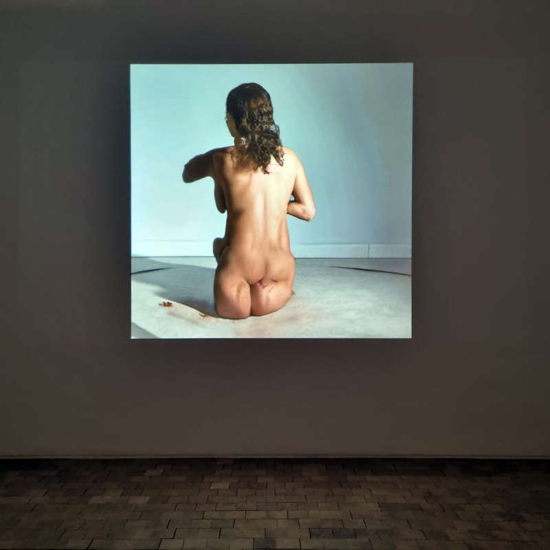 Lorsque Stine Deja et Marie Munk opèrent ensemble, leurs esthétiques dialoguent et s’entremêlent. Dans cette installation de la série Synthetic Seduction, les objets qui sont au sol semblent se poursuivre dans l’image de l’écran, à moins que ce ne soit l’inverse ! Aussi on s’interroge sur leurs similarités autant que sur leurs différences, entre sculpture et image, pour mieux en saisir la nature. Leur rondeur nous les dit organiques quand leur couleur chair évoque la peau. Statiques sur le sol, elles ont une matérialité quelque peu différente dans l’espace de l’image, là où le cadre les contraint dans leurs mouvements. Les sculptures de différentes tailles qui reposent au sol, si elles étaient sorties du cadre de l’écran pour envahir l’espace tangible de l’exposition, auraient au passage perdu de leur virtuelle brillance pour renforcer quelque peu leur présence. Comme si tout se passait dans l’interstice qui sépare les objets de leur représentation, quand bien même elle soit en trois dimensions et sans que l’on sache dans quel sens elle pourrait se déplacer.
