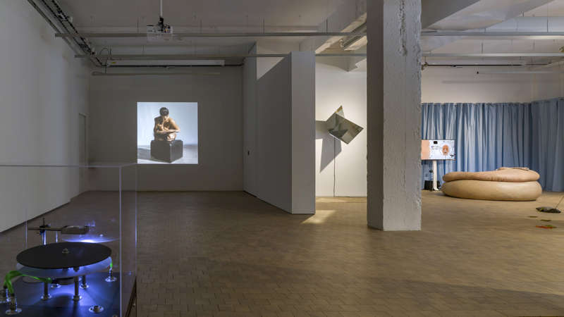 C’est dans un environnement de type hospitalier délimité par un rideau bleu que Stine Deja et Marie Munk nous invitent à prendre place sur une sculpture à la texture cutanée. D’allure organique, elle réagit au toucher comme pour simuler le vivant. C’est donc peau contre peau (Skin-to-Skin) — artificielle ou réelle — que l’on observe confortablement la séquence en trois dimensions Foreigner convoquant quant à elle l’intelligence artificielle. Car l’être qui semble découvrir son propre visage dans une salle d’éveil apparaît doté d’une conscience sans expérience aucune. C’est en tout cas ce que laisse penser la chanson des années 80 au refrain « Je voudrais savoir ce qu’est l’amour » qu’il entonne dans un tel contexte. La question des émotions des êtres artificiels est récurrente dans les scénarios de science-fiction du siècle dernier. Quand elle s’avère essentielle dans les laboratoires de recherche où émergent des agents conversationnels en quête de corps sans vécu. En attribuant des formes à leurs idées, ces deux artistes questionnent le post-humain sachant que les fictions, souvent, précèdent les sciences.