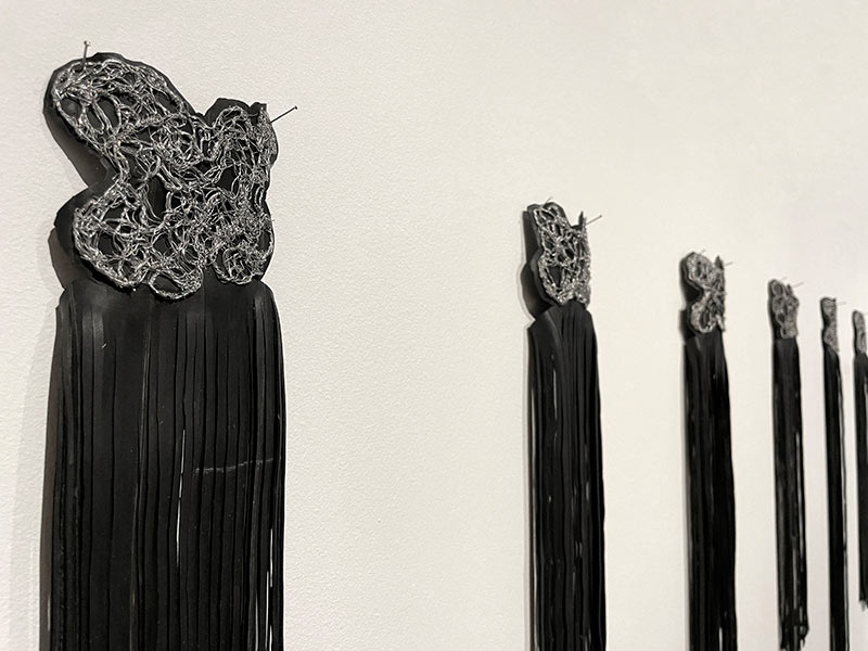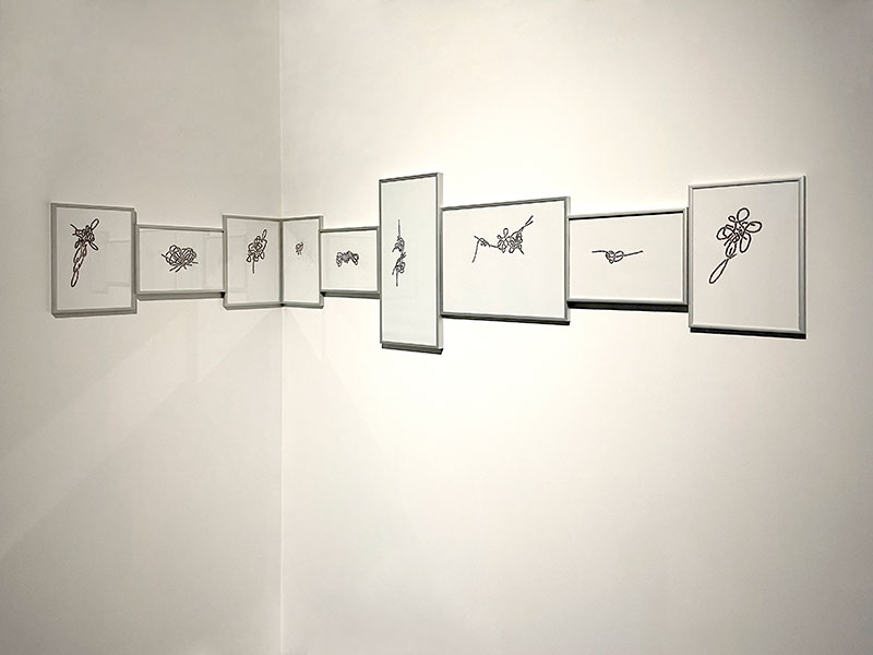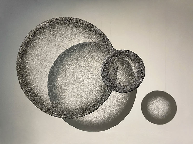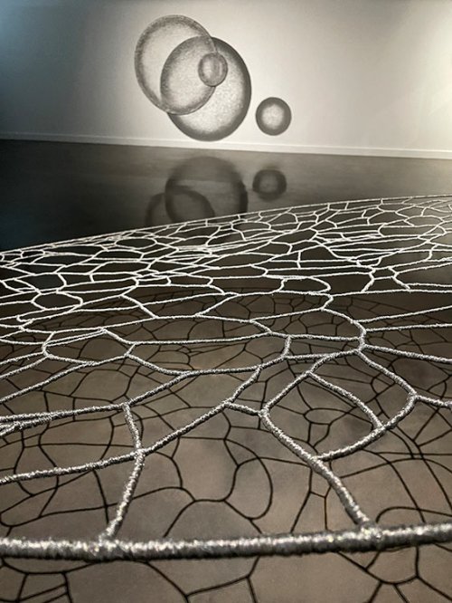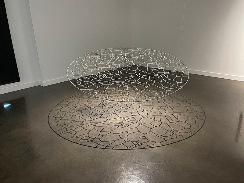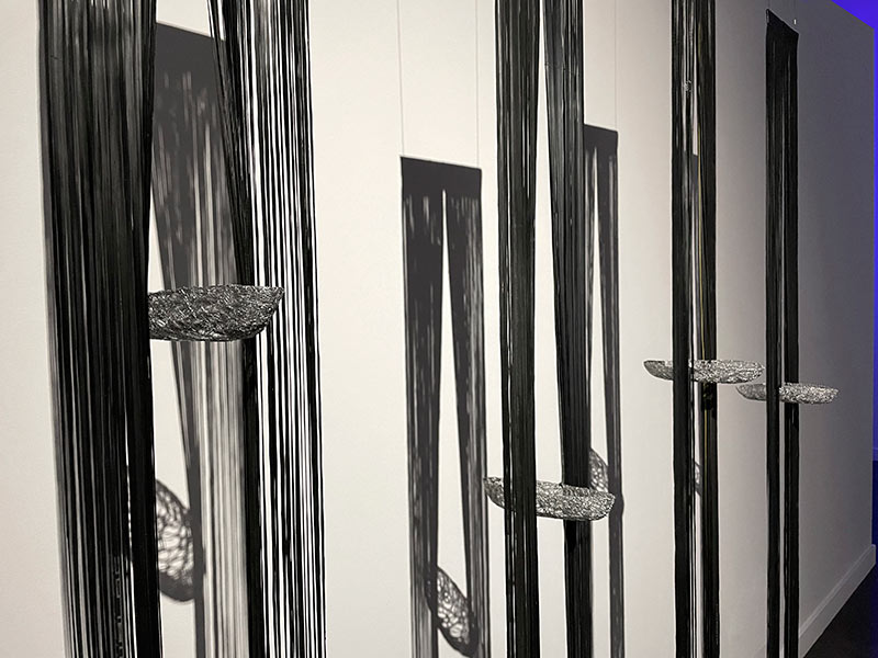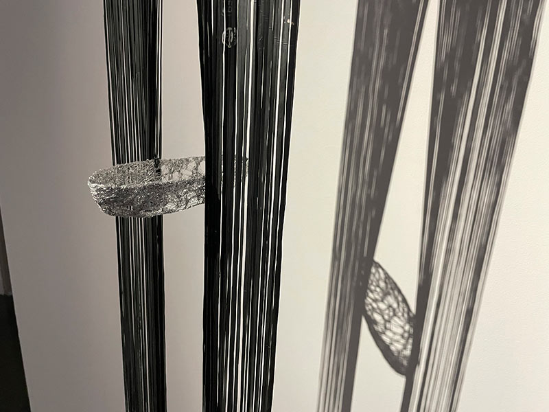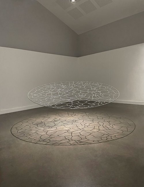 Un vocabulaire plastique qui confine à la lévitation est affirmé dans certaines œuvres. Ces dernières suggèrent en conséquence, de par les infimes mouvements de matière que l’œil est incapable de déceler, une sorte de respiration ; d’autres pièces jouent avec l’espace alentour en exploitant les vacillements subreptices des projections de lumière, à la manière des reflets aquatiques réverbérés par le soleil, de sorte que, là aussi, des mouvements extrêmement furtifs puissent caresser le regard. Ailleurs, la lumière qui traverse les cernes d’un maillage de fils métalliques, qui emprunte au lexique du vitrail, finit par projeter une arabesque d’ombres virevoltantes. Dans un autre registre, une série de dessins montre des éléments s’accumuler, se contorsionner, s’enchevêtrer, en mimant des trajectoires serpentines à la fois reflets d’une âme muselée par l’existence, et figurations d’un monde sans solution. Ici comme dans les autres compositions, les circonvolutions de fils qui s’emparent de la matière traduisent la proximité de l’artiste avec des préoccupations concrètes de nos vies quotidiennes.