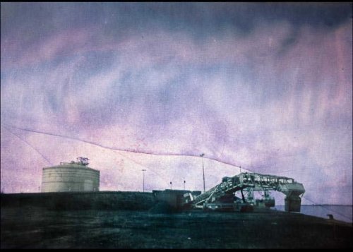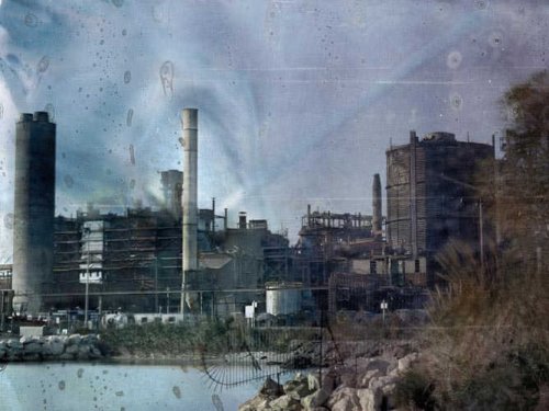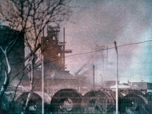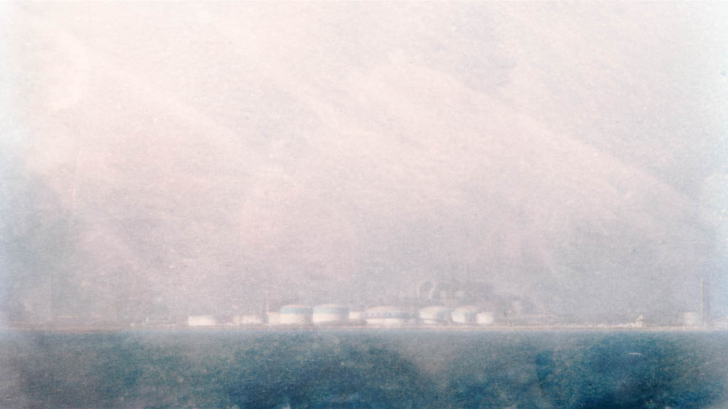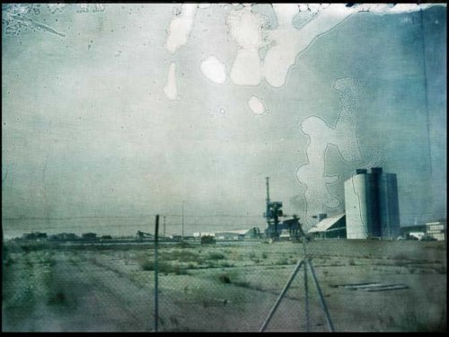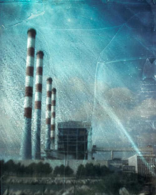 Le paysage industriel semble fondre de façon subtile aux attaques de l’altération chimique du procédé. Le cadre délimite une plongée abyssale aux couleurs violentes et douces à la fois et où la représentation perd toutes forces de constat ‘normal’ au profit d’un dépôt critique et effrayant, de celui que l’on trouve après toute destruction à l’échelle d’un territoire entier. Il opère ainsi une fusion entre le sujet et sa restitution, fusion par contamination des particules visibles et invisibles échappées de toutes ces cheminées et autres tuyaux. Ce qui fait présence dans ces images ce n’est pas tant la forme solide de l’objet représenté mais l’air, l’espace autour qui le représente. L’air rendu visible par son altération. Deuxièmement nous faisons face à l’opposé de toutes notions rationnelles liées à l’acte photographique, il montre le fantasme de la reproduction/représentation photographique. Ici l’objet photographié quitte le statut d’objectif à suivre comme matière à constat et rentre dans un autre champ : celui d’une représentation vivante donc monstrueuse, puisqu’il s’agit finalement d’objets créés par l’homme.