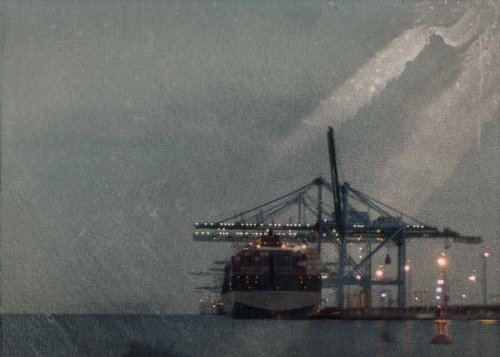 Parce qu’il part d’un matériau instable et aléatoire qui se rattache au début de la photographie tout en le révélant avec les dernières technologies numériques, il nous fait découvrir la constitution d’un ensemble sur l’industrie lourde et portuaire. Son travail reste dans la représentation de l’horizon, mais ici la matière du processus offre une singularité où l’esthétique renforce le sens.