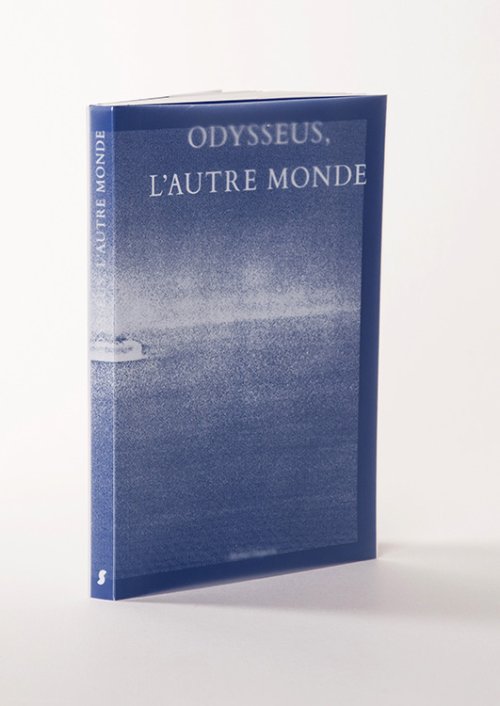 Les photographies d’Odysseus, l’Autre monde sont tirées en cyanotype, un des premiers procédés de tirage photo, qui doit son nom à sa couleur. Alors que nous voyons la Méditerranée et son ciel d’un bleu intense, le mot « bleu » n’existe pas dans la langue d’Homère. L’adjectif qui plus tard désignera un bleu foncé renvoie dans l’Odyssée au monde de la Nuit et des Enfers, c’est-à-dire à l’Autre monde. Ce livre flux entrelace les images et les mots de Michaël Duperrin, qui a également invité deux auteurs dont les écrits l’ont accompagné dans son projet à embarquer dans son Odysseus.