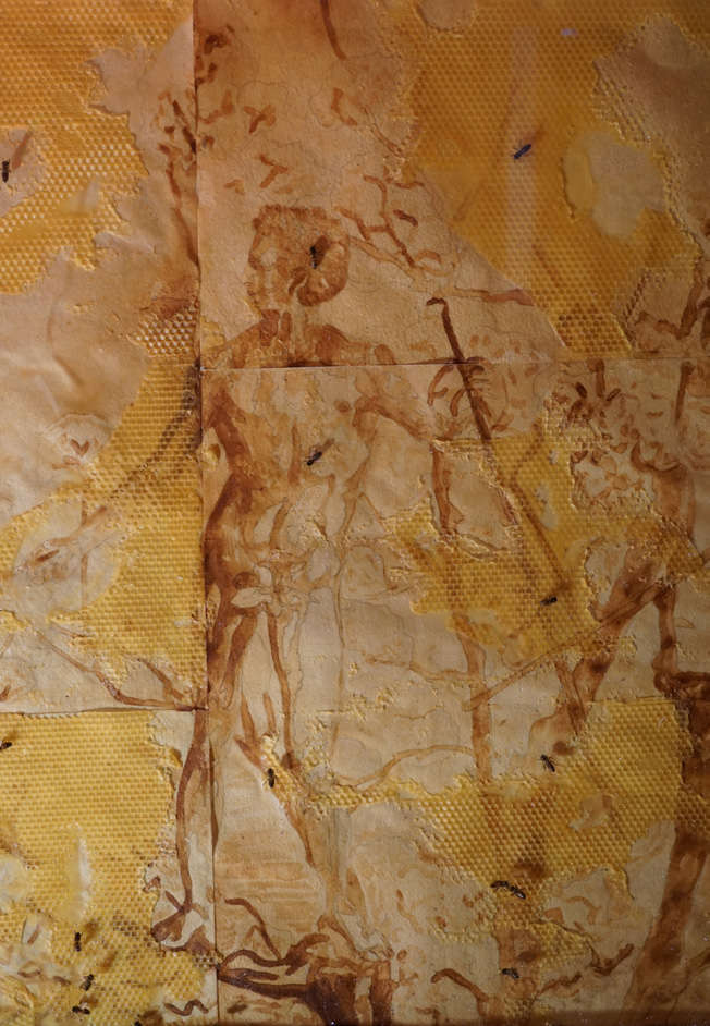Essaimage, à L’Atelier Blanc, et Sur la Brèche, au Moulin des Arts, proposent des passerelles de face à face, d’intentions et de ressentis philosophiques des artistes, utilisant cire, miel, cadres... satin, dentelle, bois, verre, citron, autant de médiums, en partie issus ou non de la ruche, et d’autres moyens d’expression au service de leur sensibilité créatrice, volumes, photographies, vidéos, dessins. Car l’abeille nourrit leurs inspirations, encourage le geste créateur, parfois provocateur, devant le triste spectacle actuel de sa fragilité, de son existence menacée, témoignant de son rôle primordial, signifiant plus que jamais sa présence indispensable à notre devenir. L’abeille messagère et anthropomorphique devient par magie créatrice...
