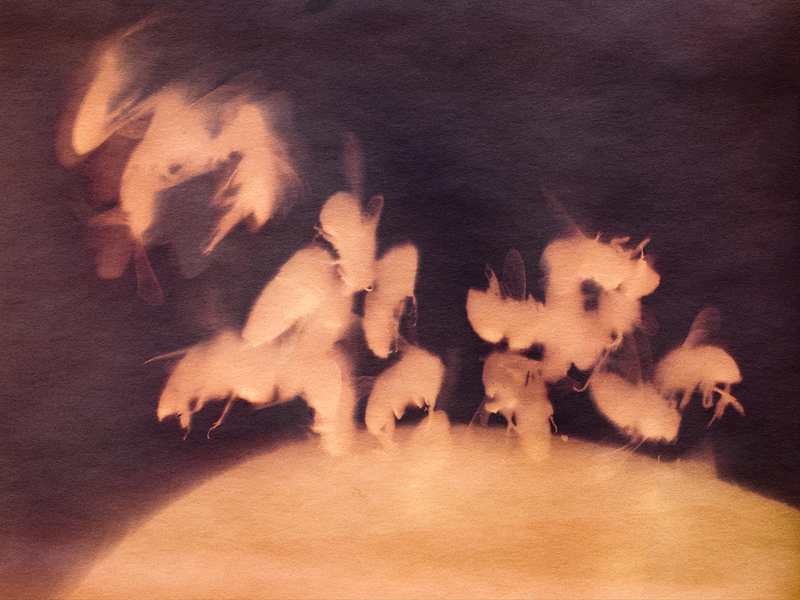 Le thème des abeilles est pour moi lié à mon enfance, plus précisément à l’implication passionnelle de mon père avec ses ruches. Durant une formation théorique et une pratique apicole au Rucher Ecole du Jardin du Luxembourg en 2015, j’ai pu observer et capter photographiquement la vie de la ruche… Cette expérience m’a amenée à développer toute une recherche plastique sur l’abeille à travers la photographie, la vidéo et le dessin. Lauréate du concours Le Trou organisé par la galerie Michèle Chomette en 2015, j’ai pu exposer mes abeilles dans la galerie parisienne.