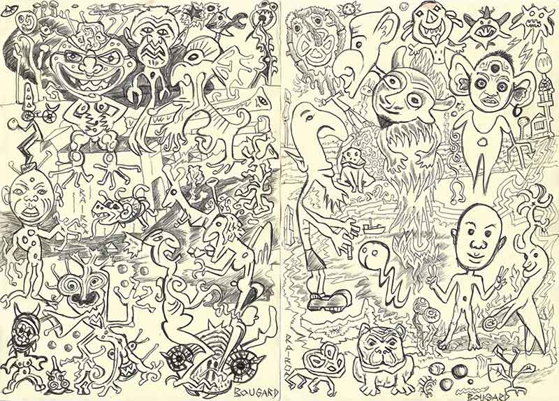 Ce dont Bougard fait l’expérience à même son art, c’est que la simplicité volontaire, le dessin, le trait, n’appelle pas à l’épure, à la transparence, à ce faux naturel limpide qui n’est que le travestissement de l’authenticité, mais au contraire à la profusion, à la saturation de l’espace, à la multiplication presque indéchiffrable de signes et de symboles.