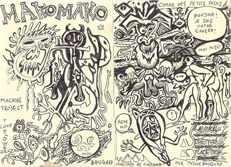 Ces bacilles du symbolique, où l’on retrouve des animaux stylisés (girafe, oisillon, poissons, serpents) peuvent aussi bien représenter une part de sauvagerie conjurée, sous la forme de tatouages tribaux ou de masques rituels, que d’innocence et d’enfance souriante, dans une sarabande fantasmagorique d’êtres féériques, enfantins, carnavalesques. Puis ces indigènes enfantins, ces femmes tatouées, ces êtres casqués de cornes, ces prêtres à hache, ces poissons volants, ces chats étranges, ces diablotins ailés, ces clowns à chapeau, footballers à bonnet, et autres gargouilles extraterrestres, finissent tous, les sauvages comme les innocents, par s’embrasser, puis par copuler ensemble tandis que se mélangent les langues au-dessus d’eux (anglais, français, tahitien) prolongeant la tradition inaugurée par Gauguin, pour célébrer, dans une grande jubilation conjuratoire, les noces blanches et noires de l’Enfance et de l’Effroi.