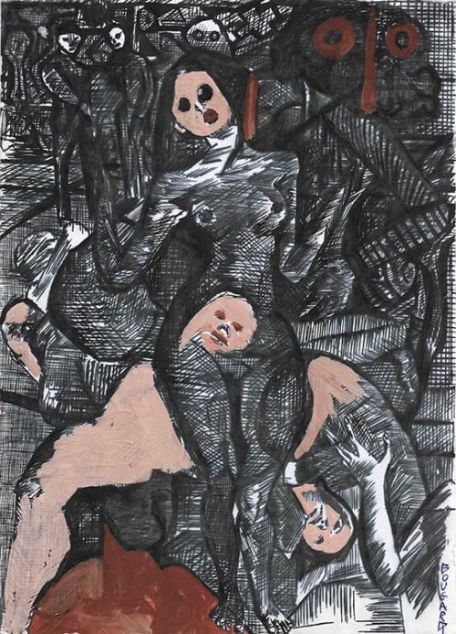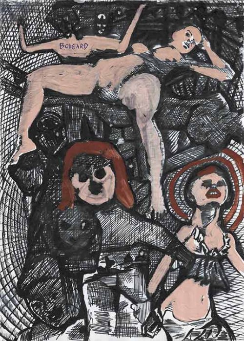 Ainsi la laideur, parfois hideuse, des figures féminines chez Bougard, aux visages démesurés, menaçants, aux corps obèses ou déformés, n’est pas celle de la victime horrifiée : elle est le reflet d’une fantasmatique angoissée, et relève plutôt d’une fascination non-érotique pour la femme, pour la femme-sorcière, grimaçante, au rictus démoniaque, pour la femme-cadavre, aux orbites noircies, à la face blanchie, pour l’obscénité fantomatique du fantasme : entremêlements de membres et d’ombres, de corps silhouettés, de visages spectraux.