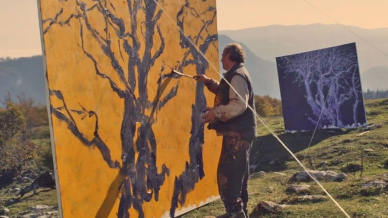 Un documentaire ? Un portrait ? Une fiction ? Un poème cinématographique ? Déjà, nous nous posons des questions, nous sommes hors catégorie, vierges en quelque sorte. Nous connaissons néanmoins des films singuliers sur des peintres, notamment Le Mystère Picasso de Henri-Georges Clouzot (1956) dont François Royet pourrait être l’héritier proche et lointain. Proche, parce qu’il immerge, par transparence, dans le processus de création-destruction ou d’apparition-disparition d’une œuvre ; lointain parce qu’aucun échange verbal ne s’immisce entre le cinéaste et l’artiste pour laisser parler les silences à travers les sonorités du geste, de la pierre de charbon, des pinceaux, du calame, des textures, du vent, des arbres, des animaux, aussi parce que son compagnonnage avec Charles Belle, s’étend sur plus de seize années et que la caméra tourne en continu jusqu’à ce qu’elle disparaisse de la conscience de l’artiste livré tout entier à ses pulsions créatrices.