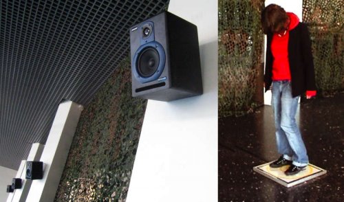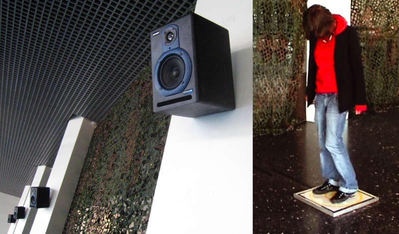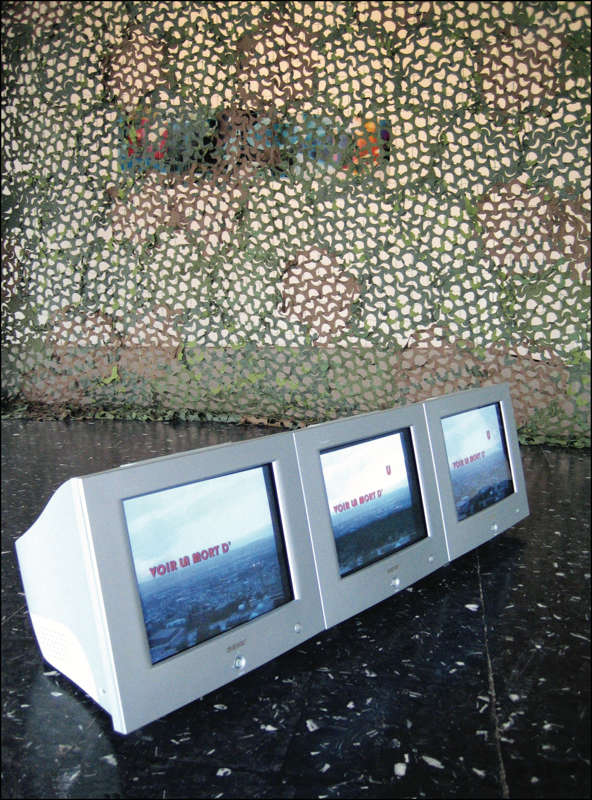 Je voulais avant tout éprouver le spectateur, qu’il ne sorte pas indemne de cette exposition. D’où le sens de la scénographie développée pour cette exposition — et du mot entre parenthèse (paradis) dans le titre de l’exposition. D’un côté, cet immense filet de camouflage et de l’autre, une toile de chantier verte délimitent un espace à la fois fermé et ouvert, où deux conceptions du jardin se confrontent. L’étymologie du mot paradis : un mot perse désignant le jardin. Jusqu’à sa racine indo-européenne : un mot sanscrit désignant le petit mur qui ferme sur lui-même le jardin. Alors, s’agit-il ici de protéger le jardin ou d’en exclure les indésirables ? Dès lors la question posée, l’horreur guette celui qui tenterait de s’en détourner. Cauchemar, mensonge et jugement viennent obscurcir ce Paradis (2005), titre de la spatialisation sonore pour huit enceintes dont le filet de camouflage était la figure. Mais elle devait aussi nous mener à autre jardin, celui où l’on fait la guerre au mode de perception que l’on a de soi-même*. C’est aussi le sens de la série des miroir-poignées : l’illusion d’une saisie conceptuelle.