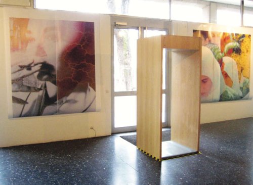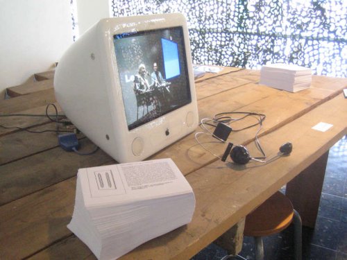 Une vidéo est visible sur un écran. Un casque permet d’écouter mais aussi de réagir par la voix grâce au micro intégré. Les interventions vocales du spectateur font apparaître des phrases animées en surimpression et de façon fugitive. Le micro électret, utilisé ici comme capteur de déclenchement, est connecté sur une carte convertisseur analogique/numérique (fourniture société Interface-Z). Les informations (protocole Midi) issues de cette carte sont acheminées via une interface USB/Midi vers un ordinateur Apple eMac G4. Le logiciel Isadora permet de gérer le déroulement de la vidéo, le son, le fonctionnement du micro, et la superposition graphique des phrases.