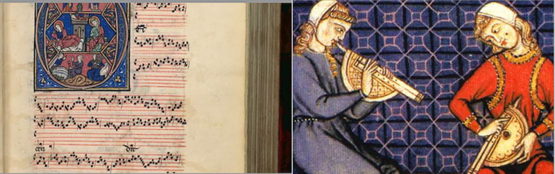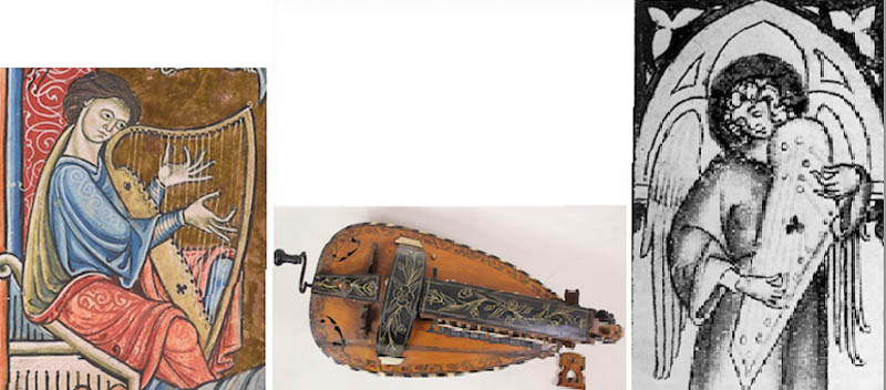 Mais ces instruments quels sont-ils ? Le violon pour commencer, celui du violoneux pas celui du « Paganinisme », l’instrument du Diable dira-t-on bien plus tard, et puis la harpe qui ressemblait davantage à la lyre de ce pauvre Orphée qu’au meuble encombrant, quoique splendide, des orchestres modernes, et puis la vielle à roue, cette machine tout à fait bizarre avec sa manivelle, son petit clavier et sa quantité innombrable de cordes dont certaines qualifiées de « sympathiques », c’est-à-dire qui entrent en résonance, et puis cette tablette de cordes qu’est le psaltérion ou cithare, rien à voir avec le sitar cette fragile guitare indienne qui à une certaine époque a tant fasciné la majorité des rockstars d’Occident, enfin la flûte, à bec ou traversière, un instrument antédiluvien s’il en est. Tout cet ensemble, « ensemble » ou partiellement, forme un voile de douceur, un filet de miel aurait avancé Hildegarde à propos des sonorités de la cithare, pour accueillir la voix délicate des femmes et recueillir l’émotion dévote des auditeurs immanquablement fidélisés. Voilà pour la forme !