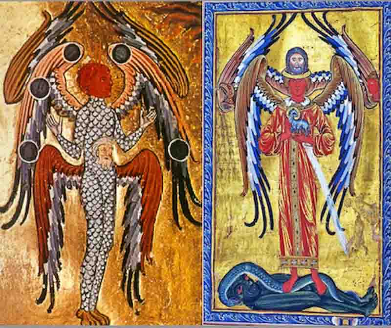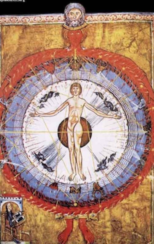 Hildegarde von Bingen est probablement la première à avoir fait chanter les anges, ou plutôt, la première, elle nous a permis d’entendre leur chant. Dotés de leurs trois paires d’ailes, une pour monter aux cieux, une autre pour plonger vers la terre, la dernière pour engager des virages serrés, les anges d’Hildegarde font des ronds dans l’espace. Par leur vol et leur chant, ils dessinent des cercles qui sont à l’unisson de ceux de l’Univers, eux-mêmes image de la divine sagesse, la sapience. « O virtus sapientiae, quae circuiens circuisti comprehendendo omnia… », Ô sagesse qui en formant des cercles enlace et embrasse tout…, enfin en gros…ça veut dire à peu près cela. Au Moyen Âge le cercle est la forme de la perfection, perfection traduite dans les rosaces du Gothique et les tondi des Renaissants. La musique, fluide céleste enveloppant, comme on l’a dit, place l’Homme en son centre pour qu’il puisse mieux la recueillir. La musique est une sphère, c’est-à-dire un cercle en volume, tout comme l’Univers est constitué d’une série de sphères — c’est-à-dire de cercles volumétrisés — imbriquées les unes dans les autres telles des poupées russes, sphères de flammes rouges, de feu obscur, de pur éther etc. avec l’Homme toujours en son centre. La musique conduit à la jouissance mystique qui elle-même amène à la « conscience cosmique ». Davantage que forme, le cercle exprime le mouvement universel qui est une ronde cosmique à laquelle l’Homme est convié une fois qu’il se sera libéré de son ego par la foi.