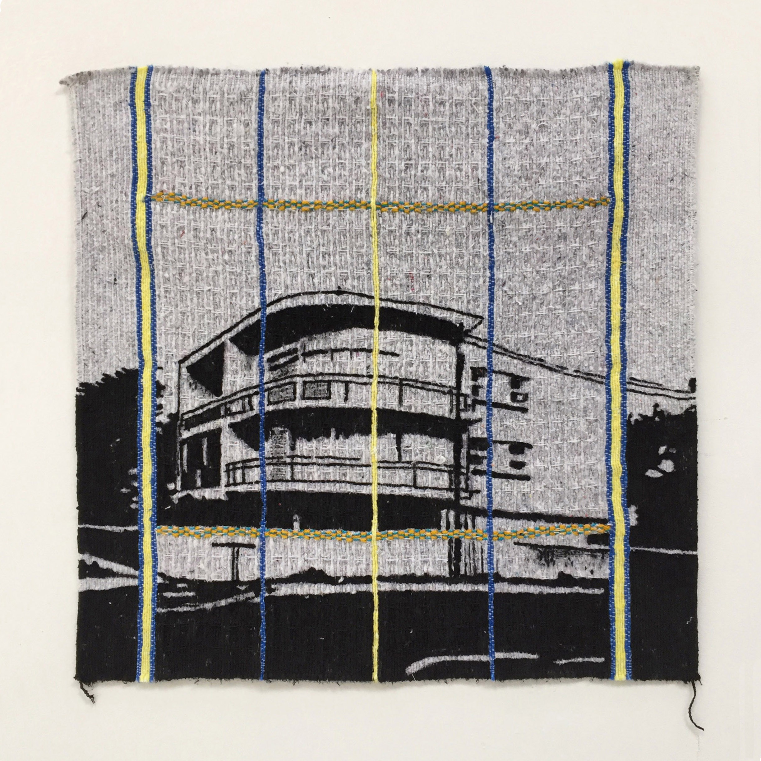 Il y aurait le tissu effiloché d’une serpillère à qui les fabricants auraient porté l’attention d’un motif, souvent deux bandes de couleur que l’artiste n’hésite pas à révéler, y ajoutant une composition géométrique et cousue, un peu molle. Dix vues de villas extraites d’une série de 100 photographies, Et tous ils veulent voir la mer peintes sur serpillère. Emblématiques, les jolies villas modernistes de la station balnéaire de Royan se glissent sous le motif du premier plan. La méthode de superposition motif/vue avec au-devant une abstraction géométrique, trame sur trame, spatialise les vues. Rendue à l’espace incertain d’une chiffonnade, la vue architecturale vacille comme la reconversion d’un mur de l’Atlantique en désir de rivages.