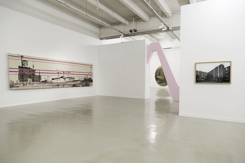 Une grande bannière sur toile à matelas étendue en avant du mur déploie le panorama d’un chantier parisien. En premier plan, un mur de graffitis, une voie ferrée, au loin des grues et bâtiments en construction. On reconnaît le palais de justice de Renzo Piano à main gauche. L’économie esthétique de la toile à matelas, bande rouge sur tissus écrus, est rehaussée par l’ajout de couleur blanche. Un tissage visuel se construit entre les bandes horizontales et le panoramique. Les façades surgissent dans le no man’s land d’un traitement ignorant des sols, oublieux de la rue, de l’avenue, d’une perspective Nevski autrefois capable de susciter la friction humaine.