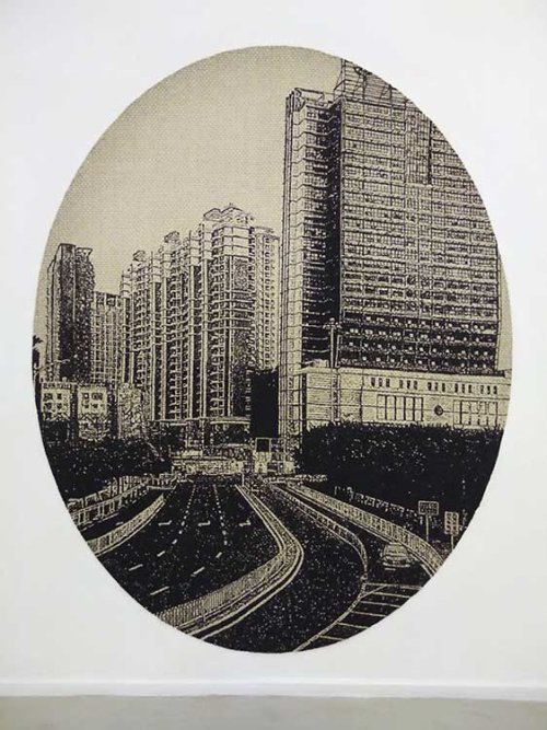 Des représentations de la ville de Shenzhen inscrivent dans une ellipse de sisal [1] de grandes dimensions, une série d’immeubles traitée graphiquement à la peinture à tableau.
