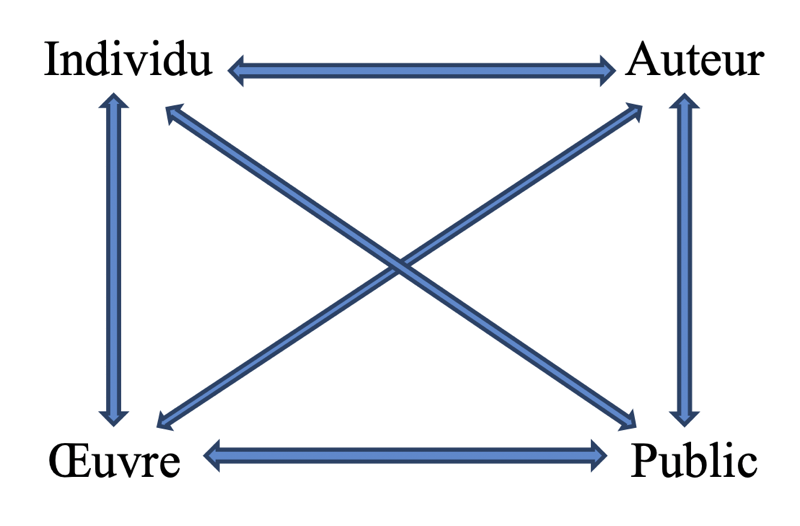 Finalement, nous avons affaire à une quadrilogie individu-auteur·rice-œuvre-public. Son premier mérite est de s’organiser autour d’enchaînements et non autour de points d’appui, de liens d’accords et de désaccords, de réussites et de revers, etc. Son second mérite est de laisser sa latitude nécessaire à « individu » de concerner les hommes et les femmes dans leur singularité ainsi que le processus de leur formation (familial, éducatif) en direction ou non d’un appel à devenir auteur ; à « auteur/autrice » de viser un type d’activité en premier lieu indéfini, vide, la visée-œuvre, ou une vie artistique pour laquelle la confrontation à des milieux, des règles, des objectifs est centrale, tout en se détachant de « individu » sans l’ignorer ; à « œuvre » de cerner des types de langage réélaborant la langue ordinaire, des conflits entre réalisations, des jeux de normes et de contestation de celles-ci en ouverture sur une adresse indéterminée, donc vide, à toutes et tous ; et à « lecteur/spectateur », ou à « public » d’évoquer des formes d’(auto-)éducation, de réformes ou de mises en question de soi. En quoi le graphe dynamogrammatique ci-dessous peut se sillonner selon les énergies sur lesquelles réfléchir.