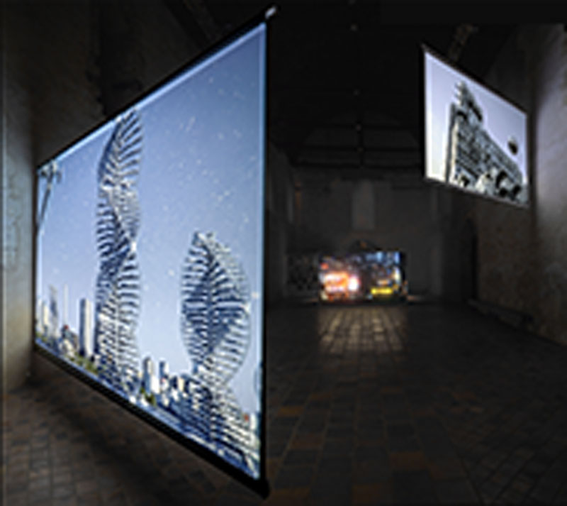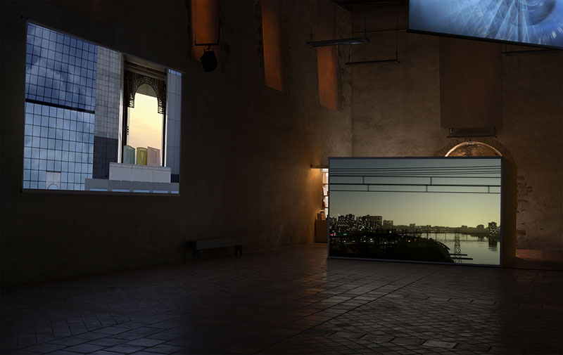 Dans l’exposition, l’artiste entremêle en permanence le réel et le virtuel, le contemporain et l’historique : il offre un vertigineux palimpseste visuel, surface impermanente où se construit et déconstruit l’identité invisible de ces villes.