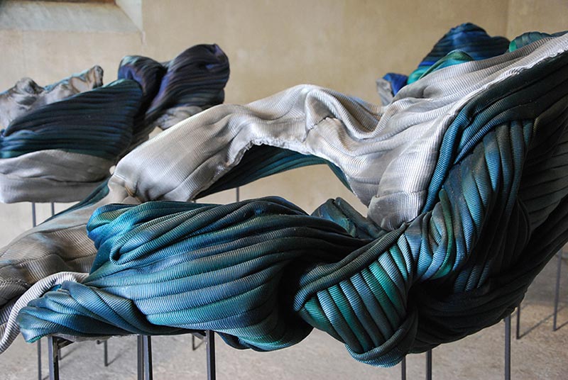 Le tissu est un organe qui se déploie pour singer la montagne et les fleuves et les lits qui la parcourent. Le tissu est un organe qui respire encore, de nouveau, maintenant qu’il s’est défait des mains de l’artiste. Le tissu, voyez son souffle, il caracole en circuit clos. Il ne porte pas la marque de l’humain, il vit seul. Et cette fin d’Homme, en ces sculptures, c’est de nouveaux êtres, emplis de vie, c’est à dire pleins de corps et d’intentions. Le tissu est peau et squelette, sang et poil, gargouillis et cris, tubes et doigts. Le tissu n’a pas de gueule mais il a un son, il possède une démarche sans membres. Le tissu voyage jusqu’aux masses de roches, jusqu’aux flux d’eau, cet empire pour lequel il travaille. Il est un émissaire pour la fonte de la figure humaine agissante et vagabonde. Le tissu devient programme informatique, avec lui se créent de nouvelles références, d’autres mondes où notre espèce s’est oubliée, où elle s’est effacée elle-même du paysage dont elle rêvait.